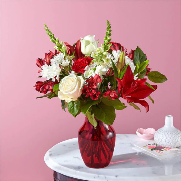 The perfect date isn’t complete without classic rose blossoms, romantic white snapdragons, red carnations, and more dreamy flowers to show your affection. Please Note: The bouquet pictured reflects our original design for this product. While we always try to follow the color palette, we may replace stems to deliver the freshest bouquet possible, and we may sometimes need to use a different vase.