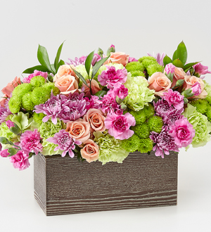 Capture the beauty of the seasons in bloom with our Simple Charm Bouquet. Gorgeous blooms such as peach spray roses, green trick dianthus, pink mini carnations and lavender cushion pompons fill a weathered wooden box with freshness.